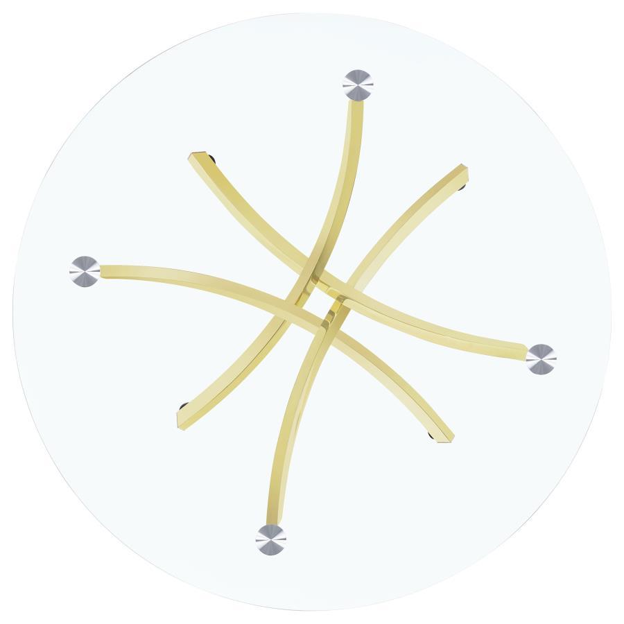 Modern meets bold in this everyday dining table. round table top is constructed of glass for a contemporary feel. legs crisscross in a stylish pattern that imparts both style and durability. consider chairs with lustrous chrome styling (available separately) to complete this set. table looks great in dining space with sleek furnishings and modern decor.