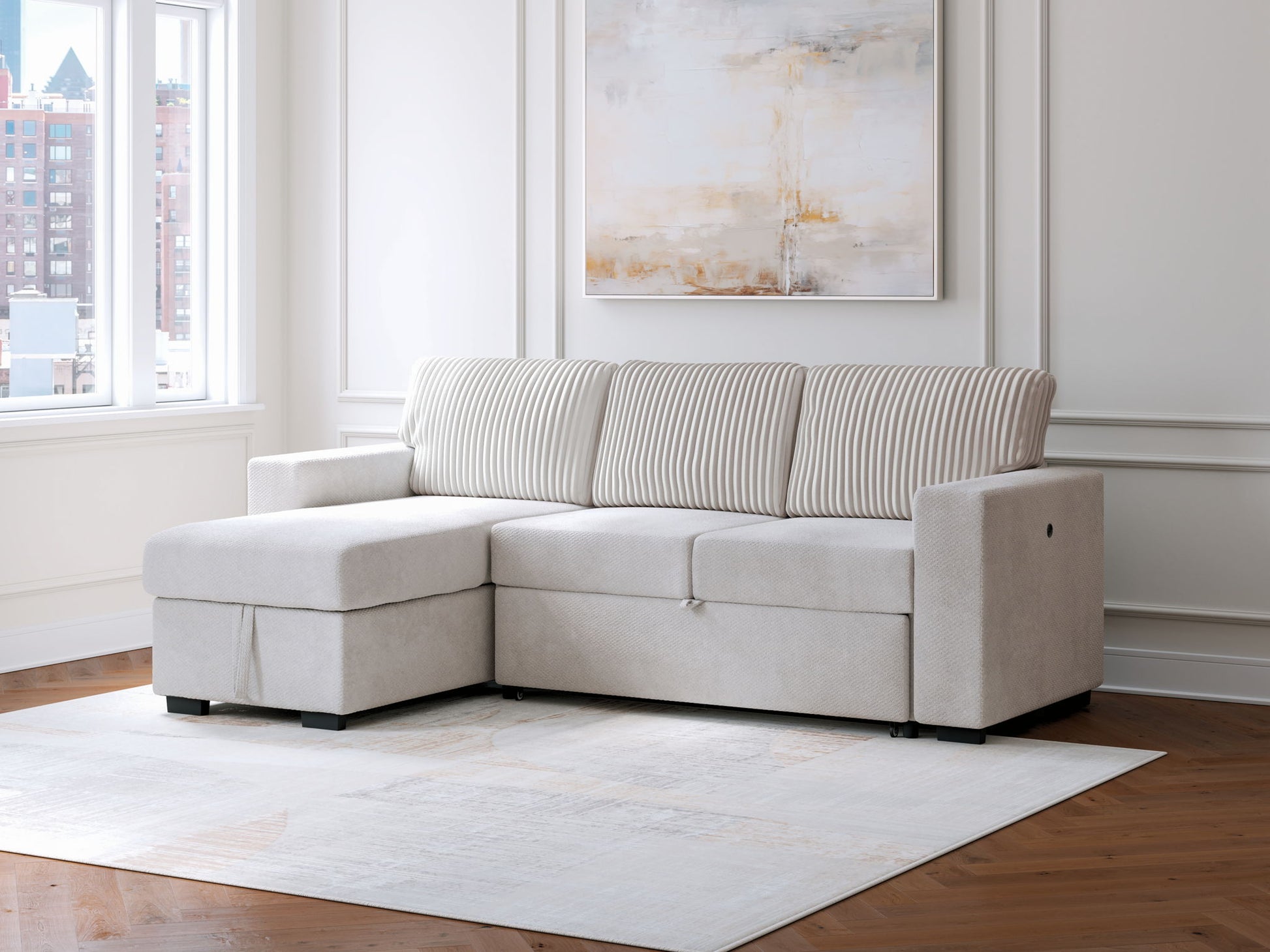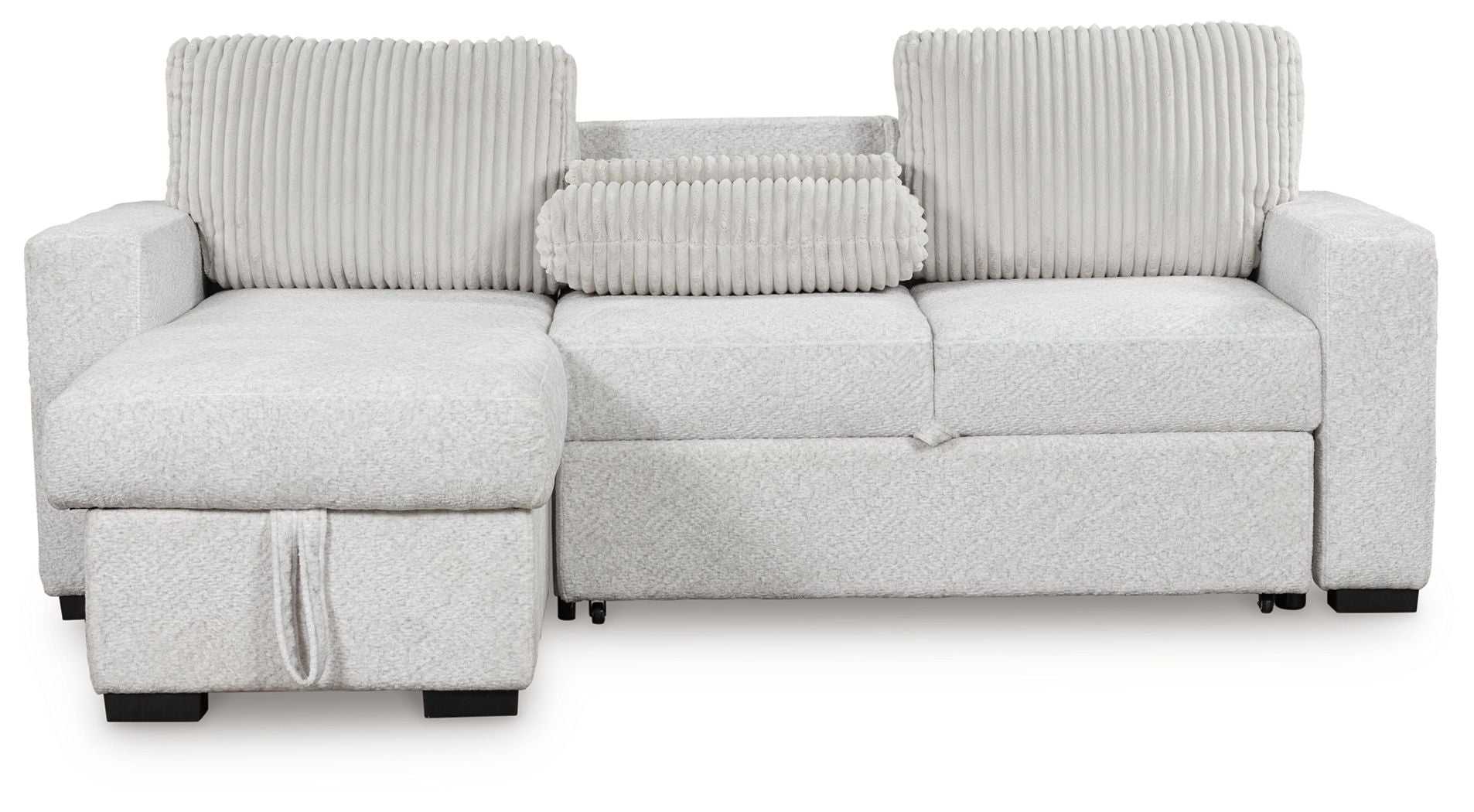 - Includes 2 pieces: left-arm facing corner chaise with storage and pop up sleeper with drop down table